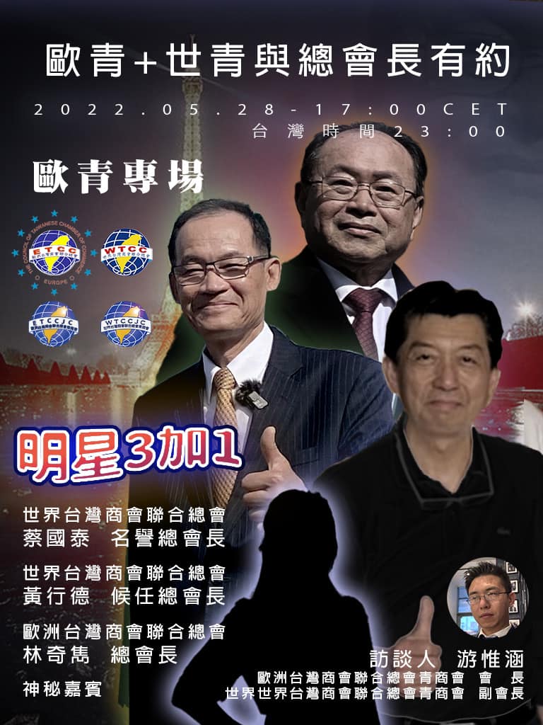 ⭐️ 歐青第11屆團隊主辦與世青第12屆團隊協辦「青商與總會長有約」,即將在台灣時間2022年5月28日 週六晚上11點,由歐洲台灣商會聯合總會青商會會長游惟涵親自主持,帶您認識來自法國巴黎的世總名譽總會長蔡國泰、世總候任總會長黃行德、以及歐洲總會長林奇雋。